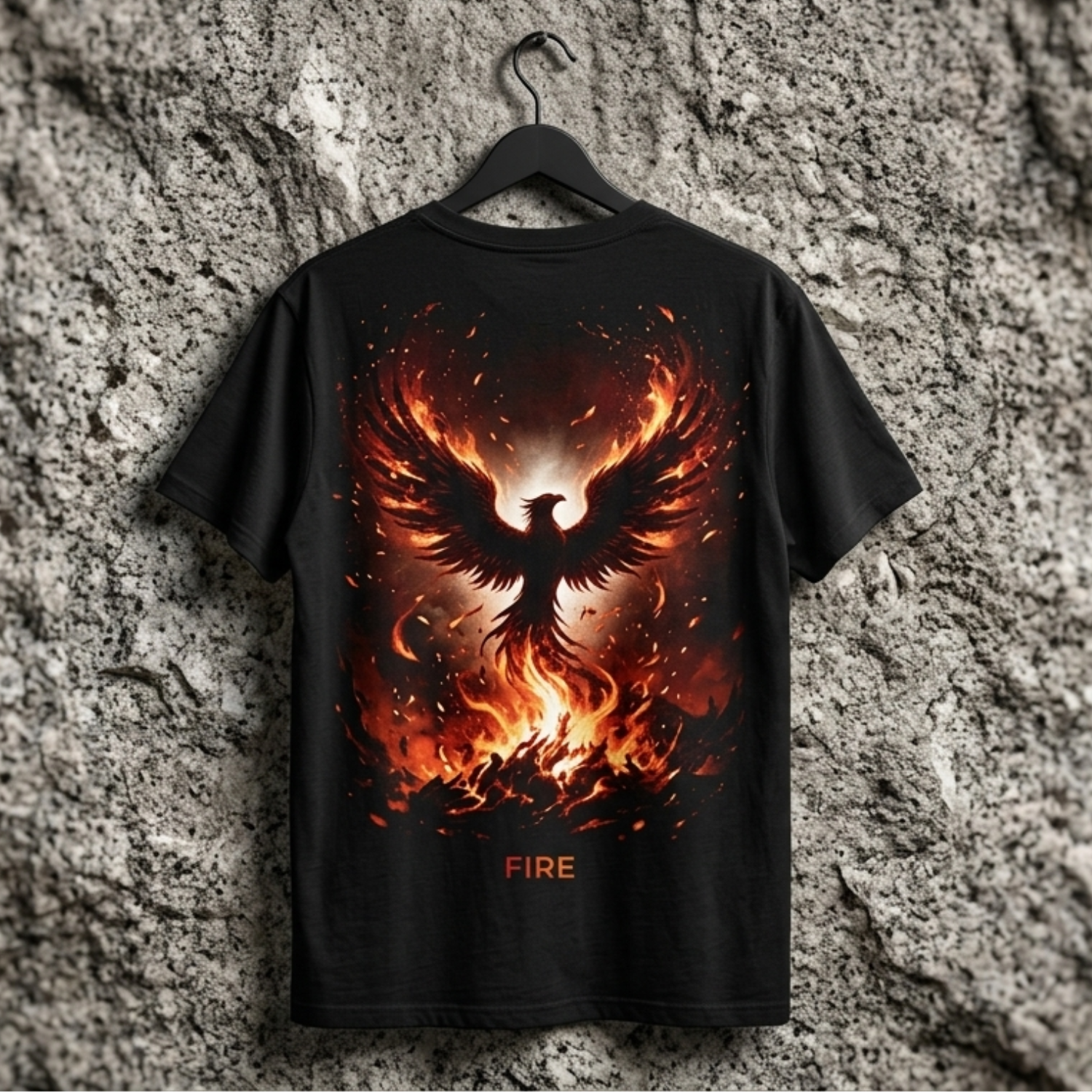 Raw power. Burning at the core. The element of the drums. Front: small Skytribe logo on the left chest with "FIRE" beneath. Back: a phoenix rising from an eruption of flames and embers, wings spread wide, burning everything in its path. For those who bring the heat and never burn out.