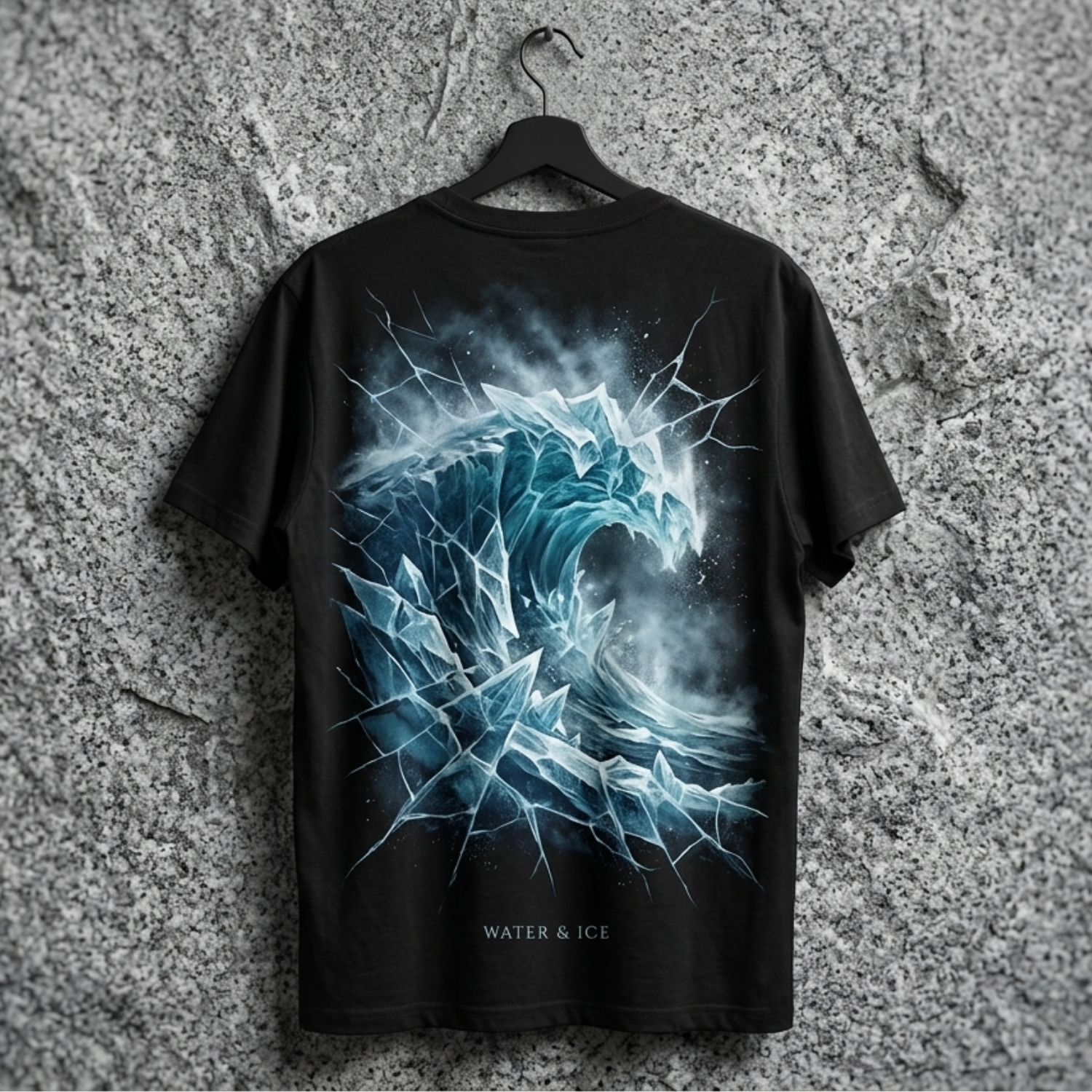 Untameable. Sharp. Cutting through everything. The element of the voice. Front: small Skytribe logo on the left chest with "WATER & ICE" beneath. Back: a frozen wave shattering into jagged ice shards — cold, raw, and unforgiving. For those who carry the weight of water and the edge of ice.